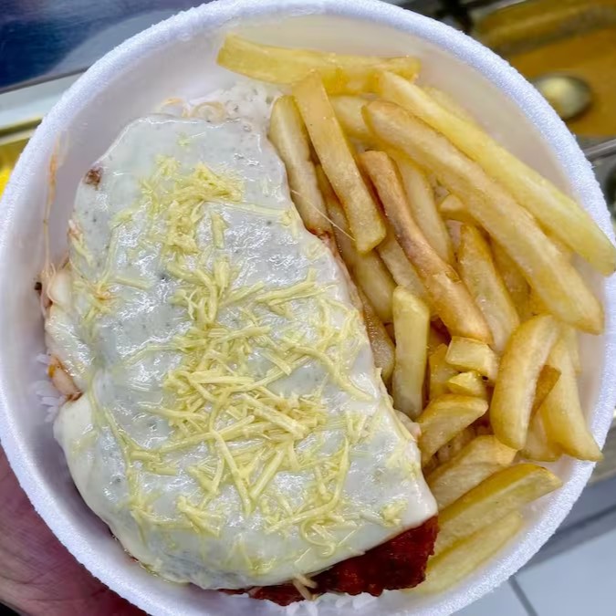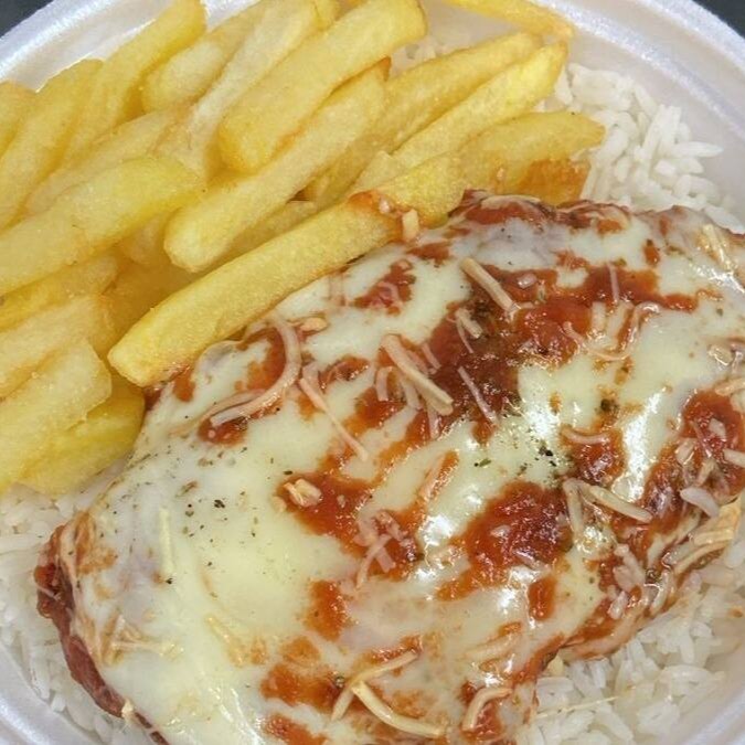 vai com Arroz, Batata frita, e nossa exclusiva Parmegiana De Frango com pouco molho especial, pra você se deliciar com o melhor da comida mineira!