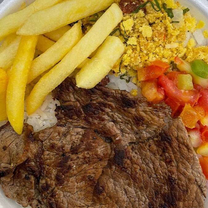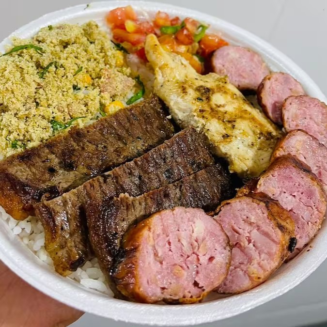 Conheça nossa marmita classica de churrasco que acompanha arroz, feijao, farofa, vinagrete, alcatra,frango e linguiça, aproveite!
