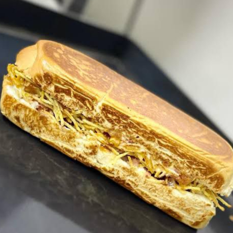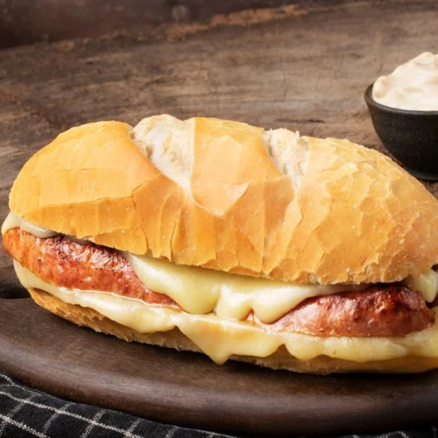 Delicioso pão de baguete prensado na chapa , linguiça de qualidade, muçarela, vinagrete fresco feito no Dia, molho barbecue da casa e maionese