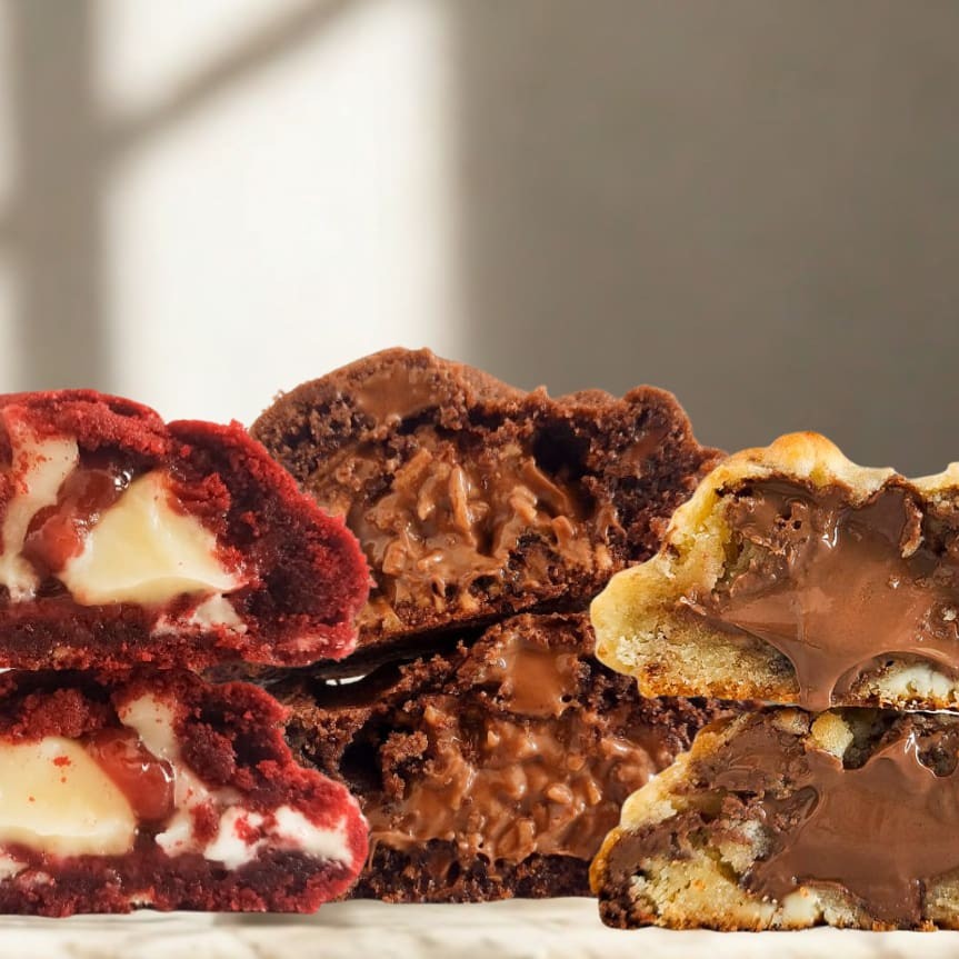 Nosso combo campeão, mais pedido da Jô. Com os 4 cookie preferidos de 120g, perfeitos para quem quer provar o melhor de tudo. Cookies grandes, macios por dentro e crocante por fora. O combo inclui: 🍫 Cookie Nutella (Massa rica feita com três tipos de chocolate, recheada com Nutella cremosa.) ❤️ Red Velvet (Cookie red velvet macio, recheado com ganache de cream cheese e geleia artesanal de frutas vermelhas.) 🍪 Chocolate Chips (Cookie clássico com chocolate ao leite e amargo, equilibrando doçura e intensidade.) 🍫 Fudge Brownie(Cookie de chocolate intenso, recheado com brownie e ganache meio amargo, textura úmida e marcante). Todos assados na hora!