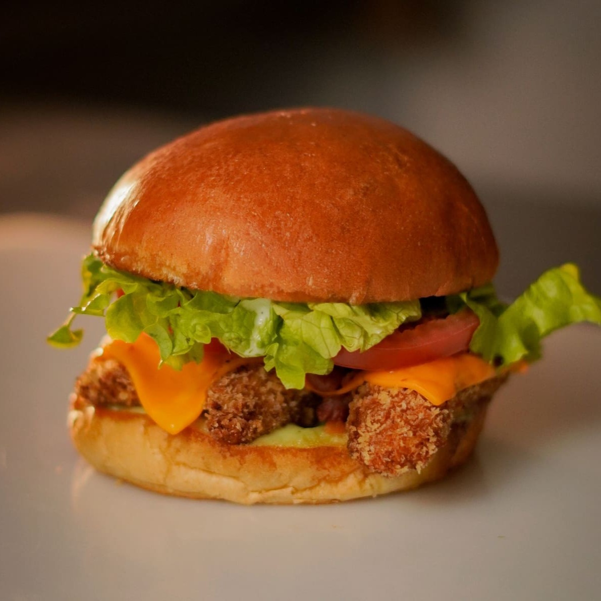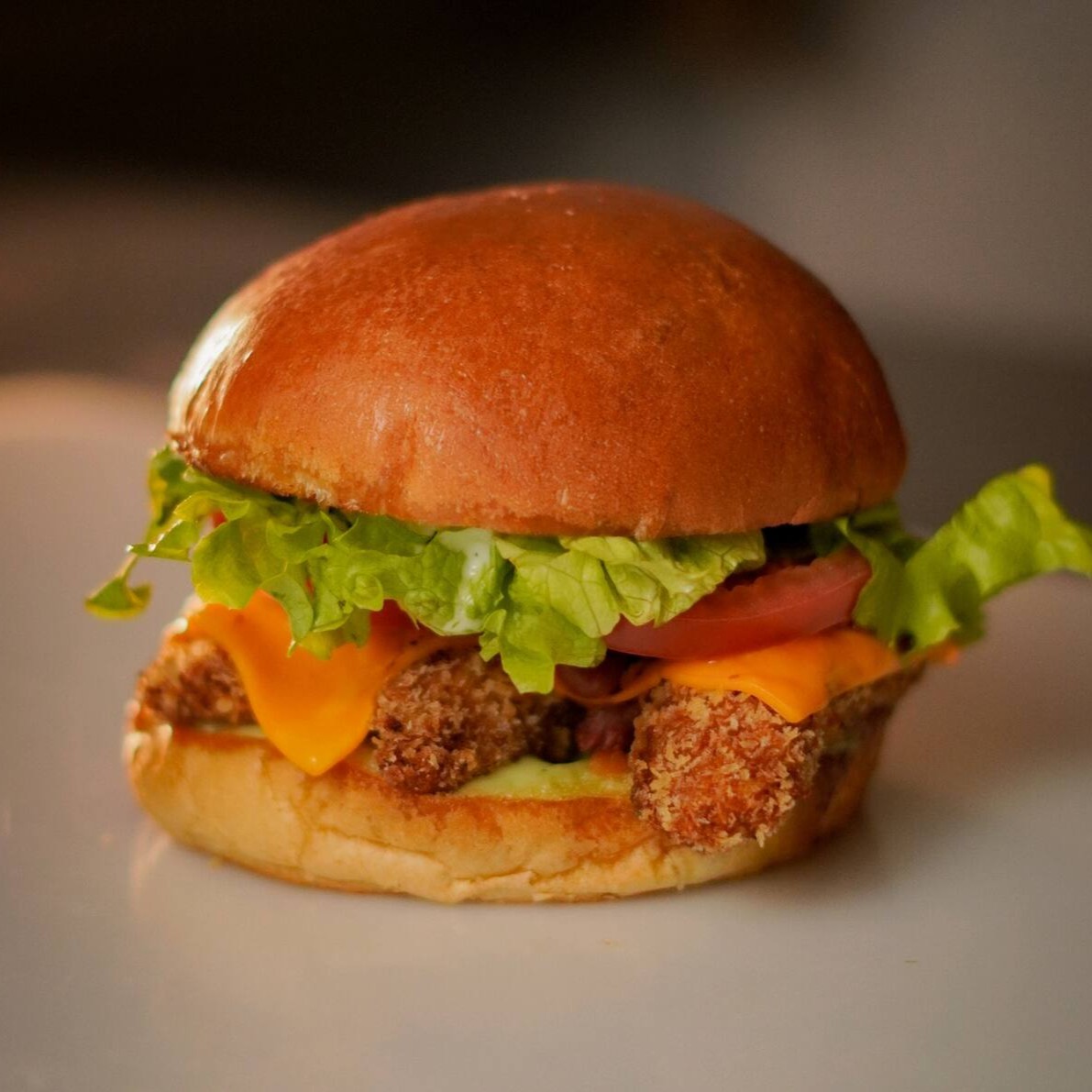 Chicken Sandwich: Pão brioche, tiras de filé de frango, cheddar, bacon fatiado, molho Barbecue, alface e tomate.