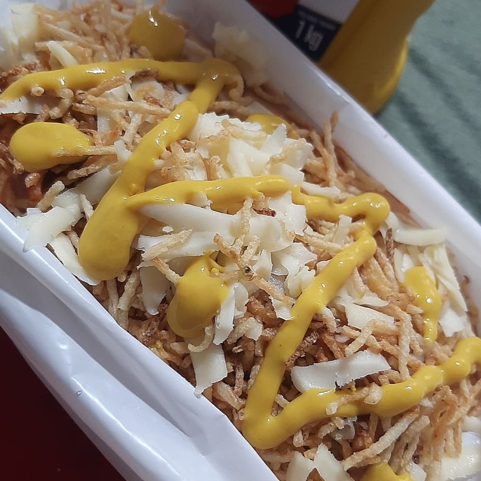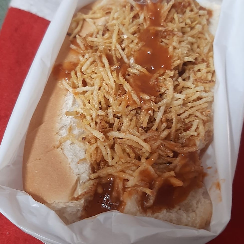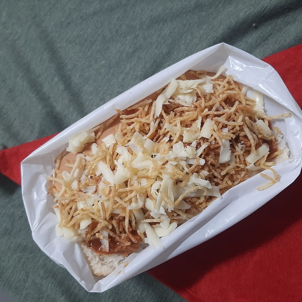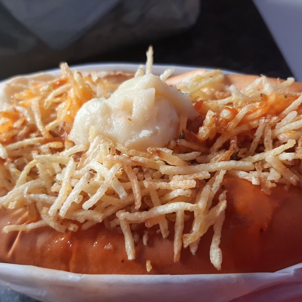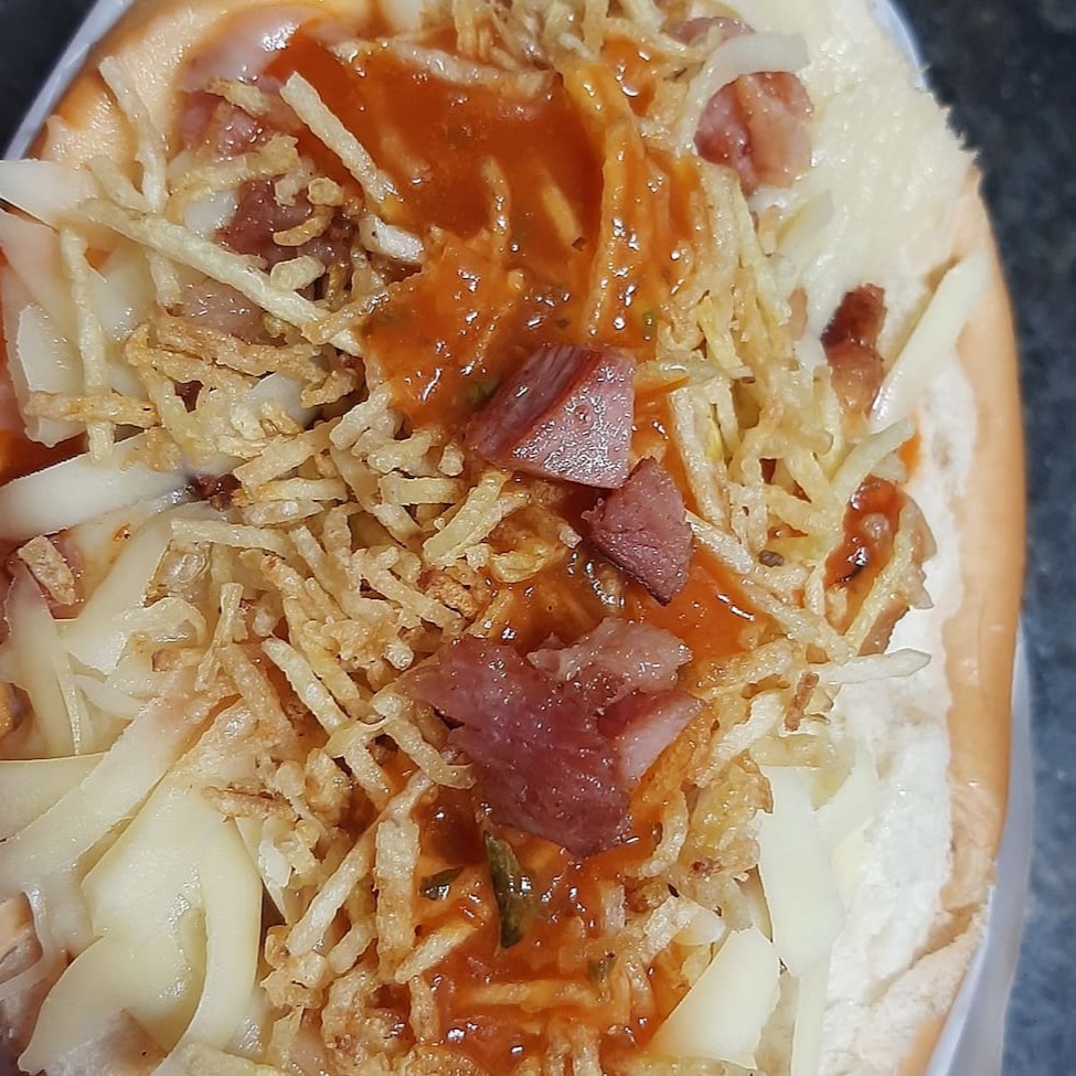 Pão, molho vermelho, 2 salsichas, purê na manteiga, bacon, queijo mussarela, batata palha.