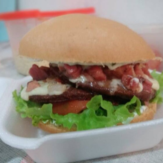 Pão, molho da casa, alface, tomate, 2 hambúrgueres, bacon e queijo mussarela.
