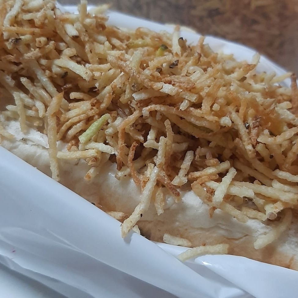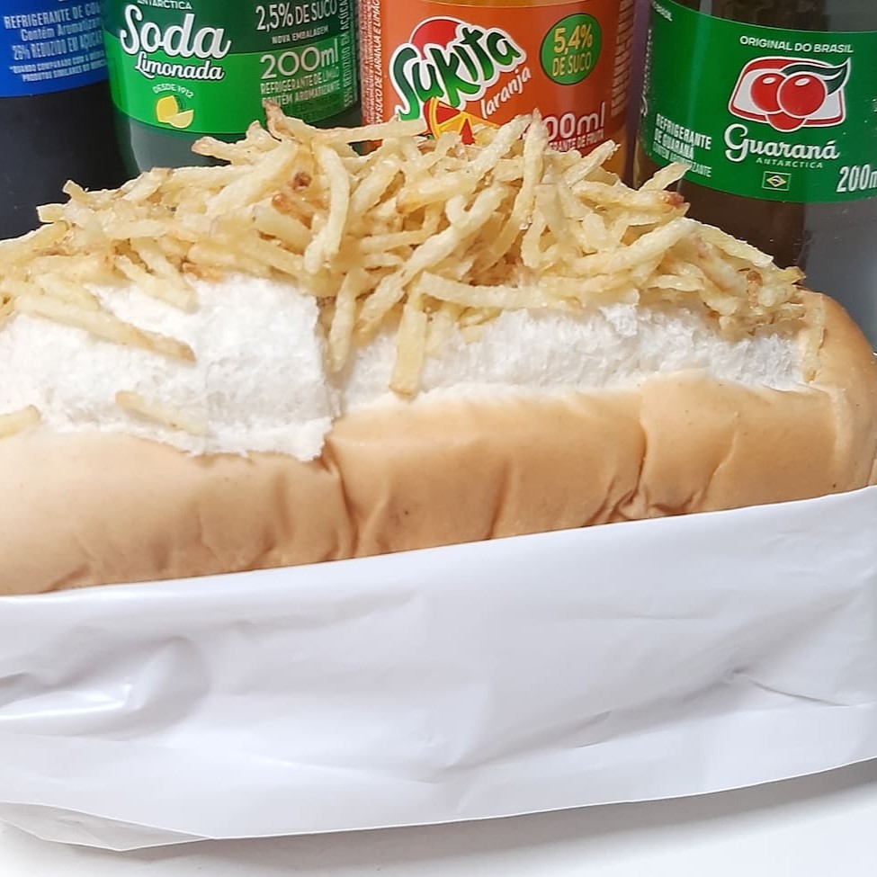 Pão, molho vermelho, 2 salsichas, batata palha