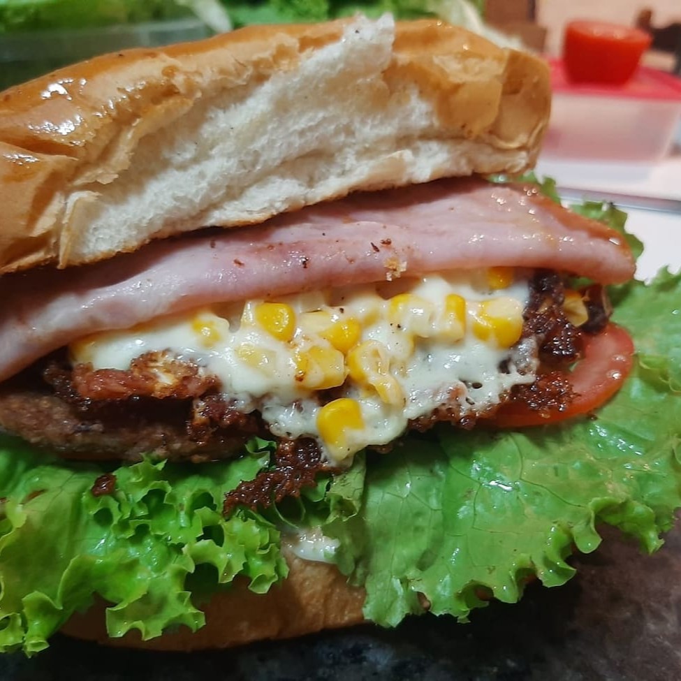 Pão grande, molho da casa, 4 hambúrgueres, alface, tomates, milho, Bacon, 2 ovos, fatias de presunto, queijo mussarla, batata palha, cheddar.