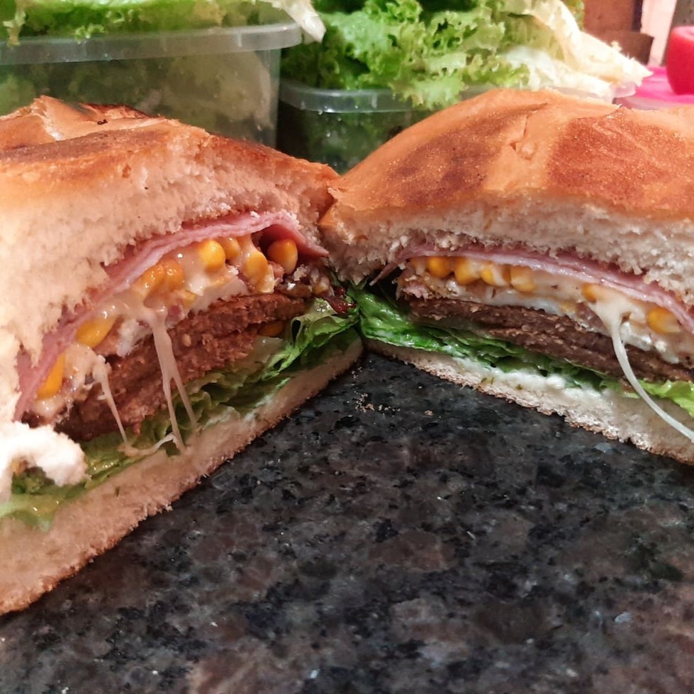 Pão grande, molho da casa, 4 hambúrgueres, alface, tomates, Filé de frango, 3 ovos, queijo mussarela. Uma deliciiiaaa!!!