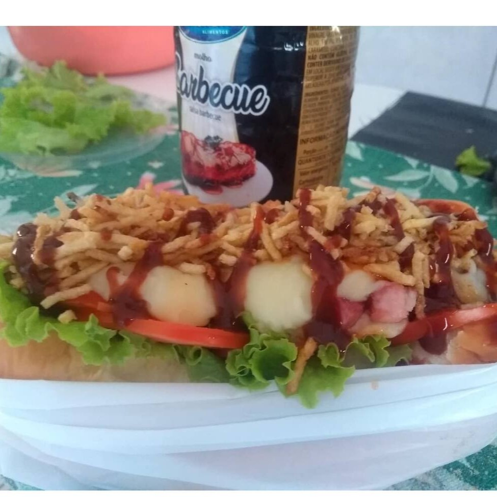 Pão, molho vermelho, 3 salsichas, barbecue, mostarda, queijo mussarela, batata palha.