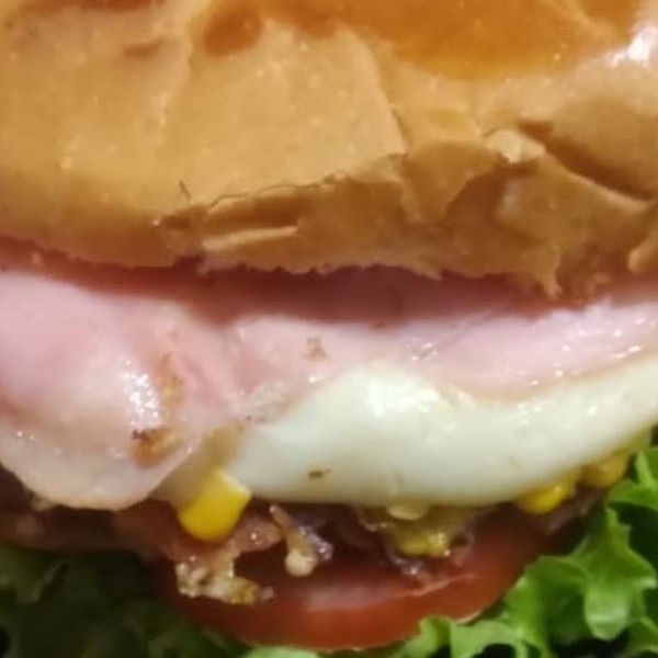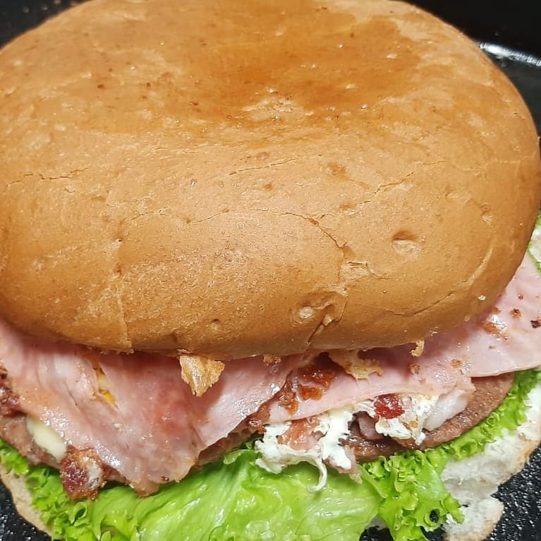 Pão , molho da casa, Alface, tomate, 2 hambúrgueres, bacon, milho, presunto em fatias, Ovo, queijo mussarela.