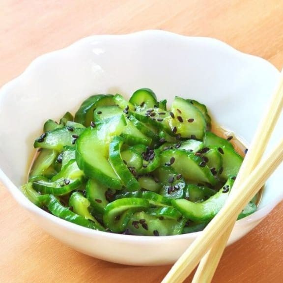 Salada de pepino japonês, marinado no molho agridoce, com leve toque de gergelim.