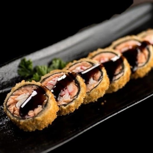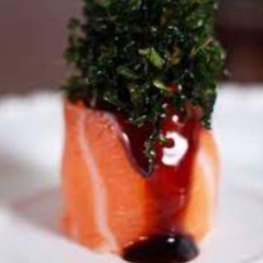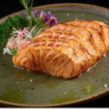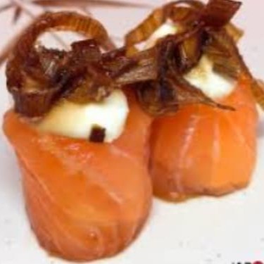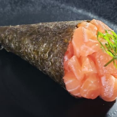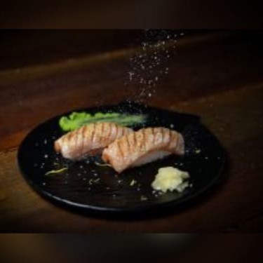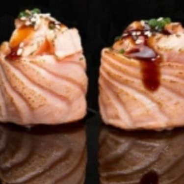 Lâmina fina de Salmão maçaricado, azeite trufado e flor de sal, sobreposta em bolinho de arroz 6 unidades