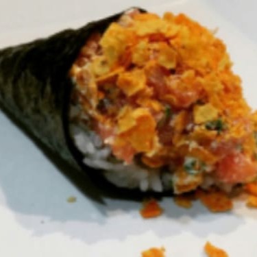 Lâmina fina de Salmão maçaricado, pimenta sriracha, sobreposta em bolinho de arroz 6 unidades