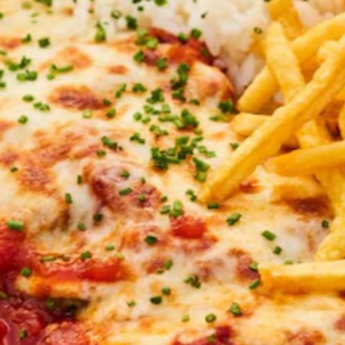 Bife bovino à parmegiana acompanha arroz e batata frita