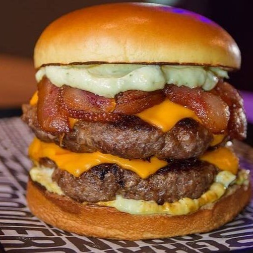 Pão brioche, hambúrguer caseiro 150g, queijo prato, cebola roxa, bacon, ovo, onion rings, cheddar, Catupiry.