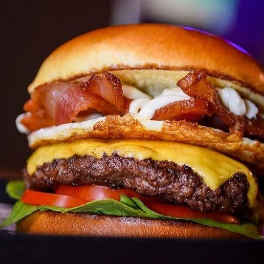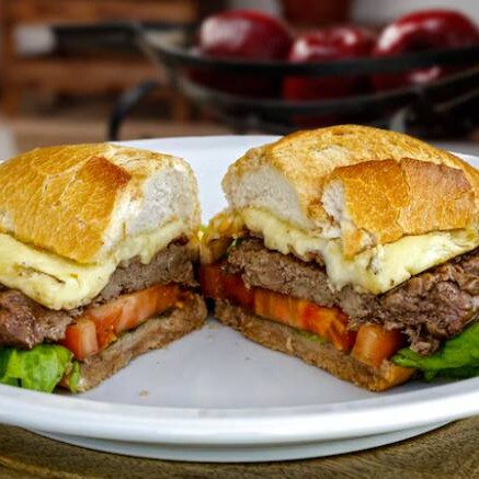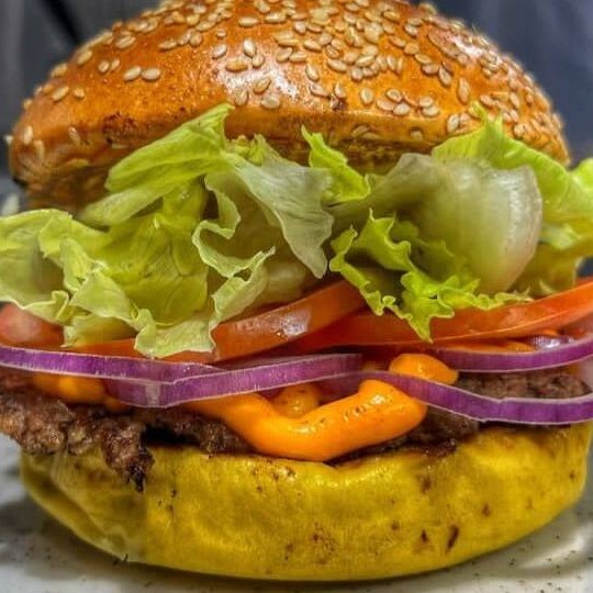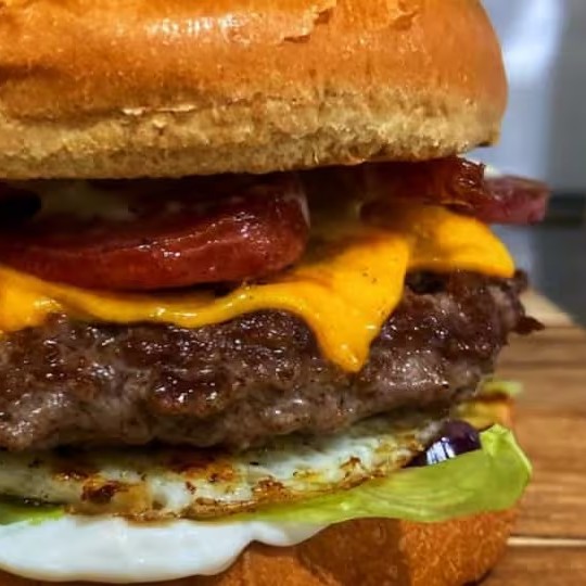 Pão brioche, hambúrguer caseiro 180g, queijo prato, ovo, cebola caramelizada, alface, tomate, cheddar.