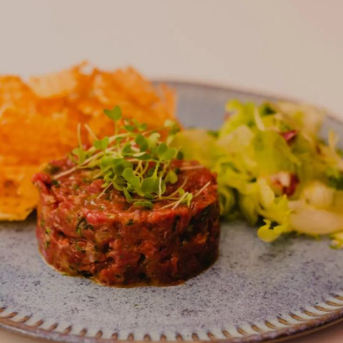 Tartare Batata Gaufrette Salada Verde