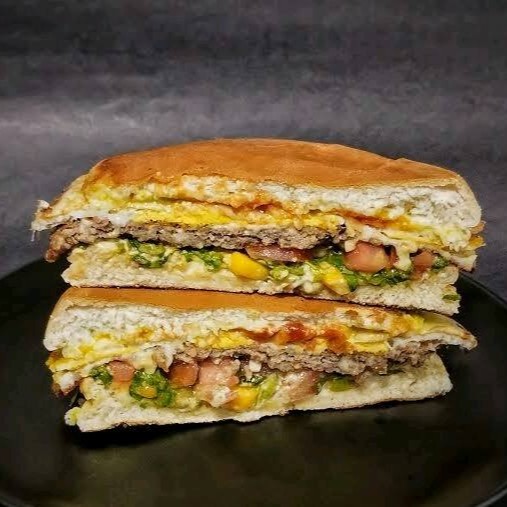 2 hamburgueres, 2 ovos , bacon,presunto,mussarela,milho,batata palha,alface,tomate, Catupiry ou cheddar