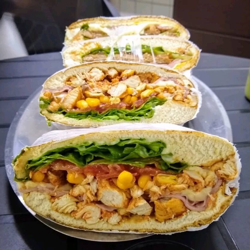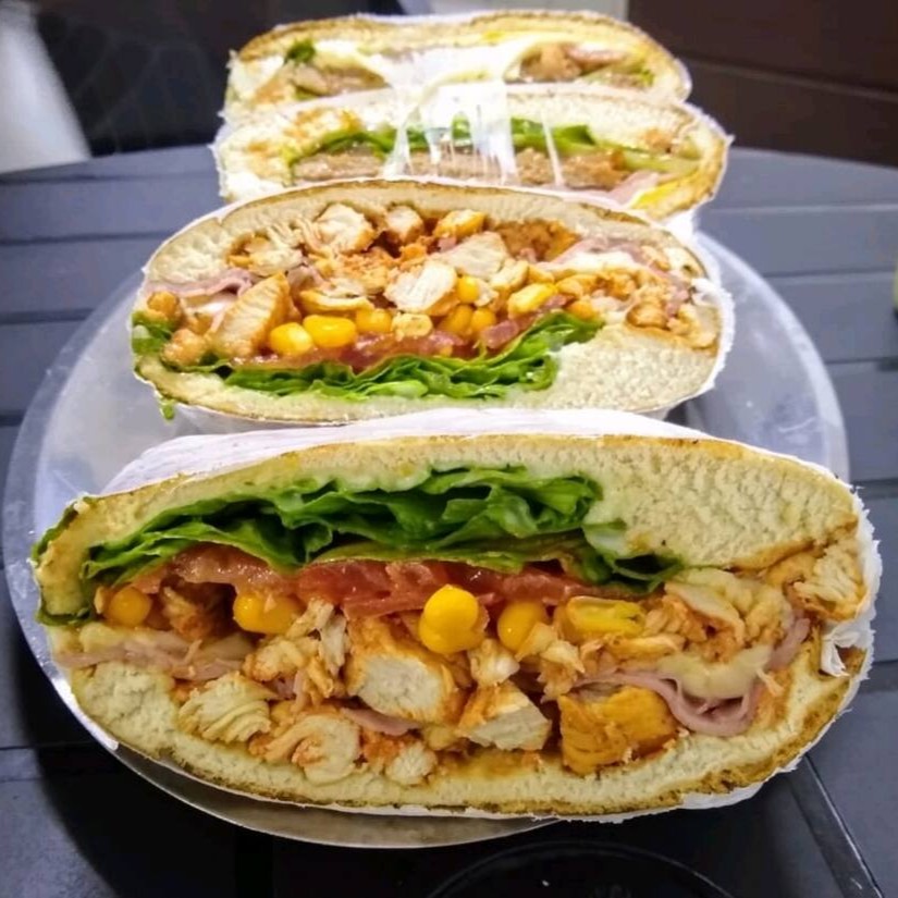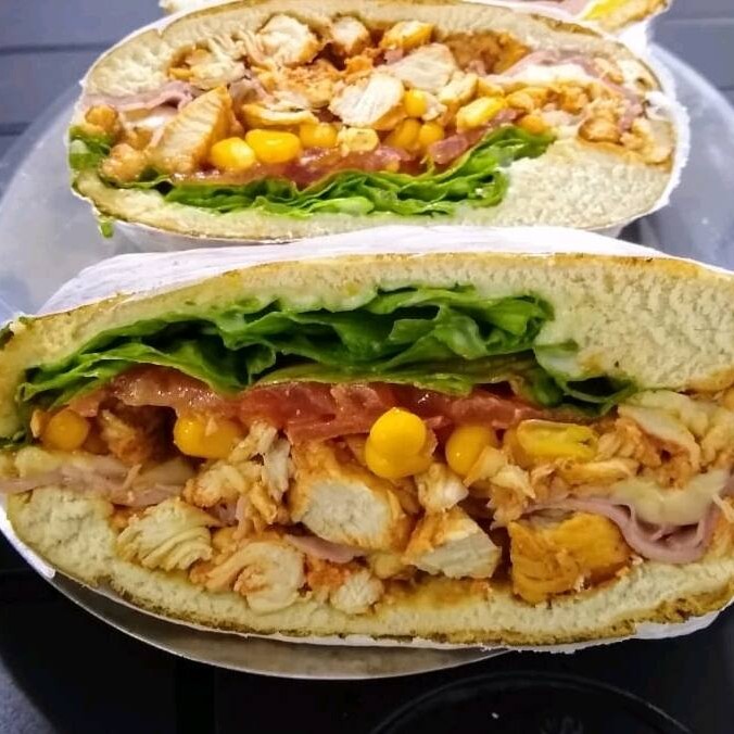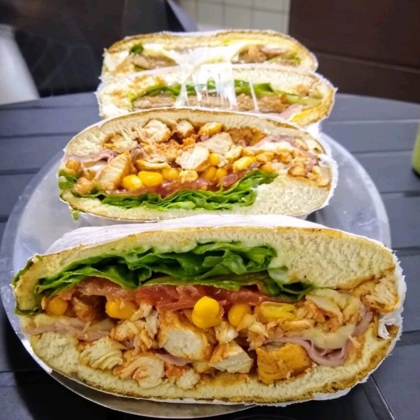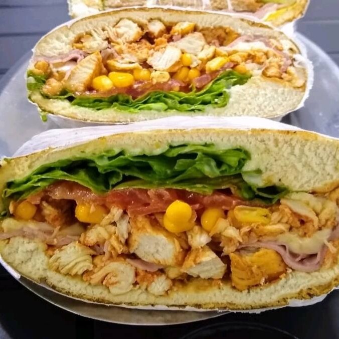 Pão, filé de frango, presunto, mussarela, milho, alface, tomate, catchup e maionese