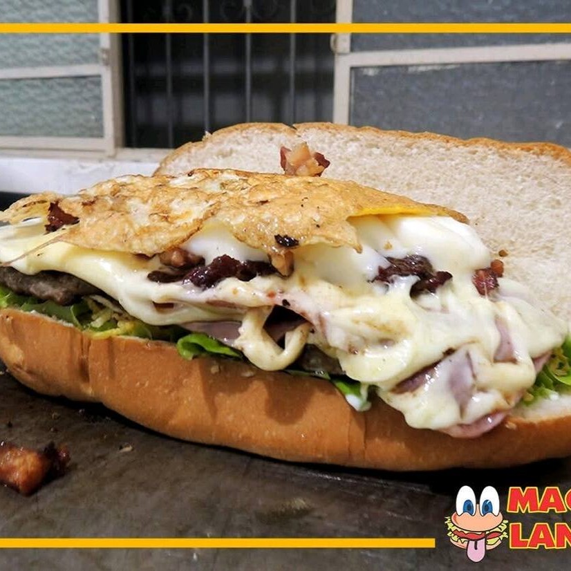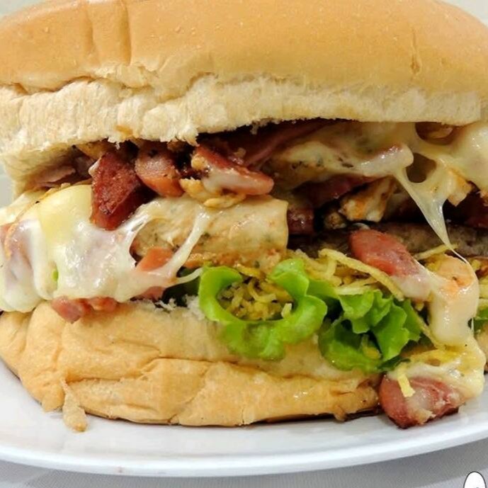 Pão, 3 hambúrgueres, bacon, ovo, presunto, mussarela, Catupiry, milho, batata palha, alface, tomate, catchup e maionese