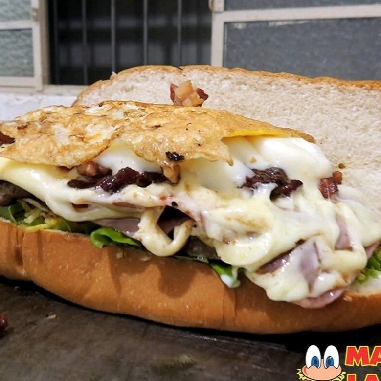 Pão, filé de frango, presunto, mussarela, bacon, ovo, milho, alface, tomate, catchup e maionese