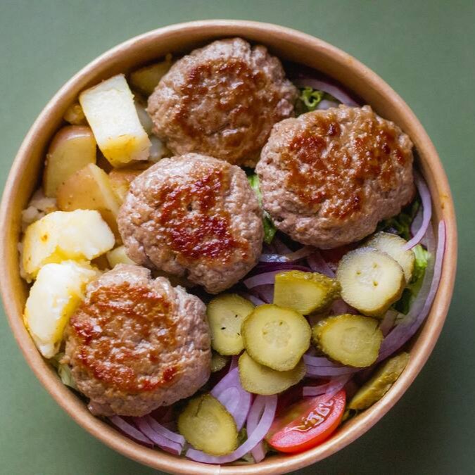 Batatas assadas, mix de folhas, milho, cebola roxa, picles de pepino, muçarela ralada, bolinhos de carne e molho.