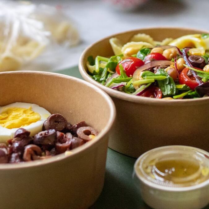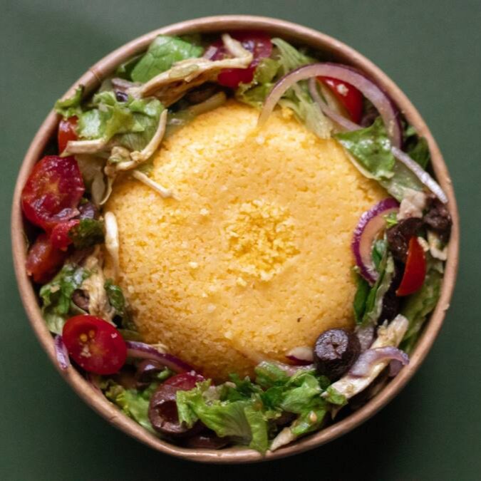 Nossa deliciosa SALADA SUSTÂNCIA (cuscuz quentinho e soltinho, frango desfiado suculento, mix de alfaces, tomate cereja, cebola roxa e azeitona preta) + caçulinha. Que tal?