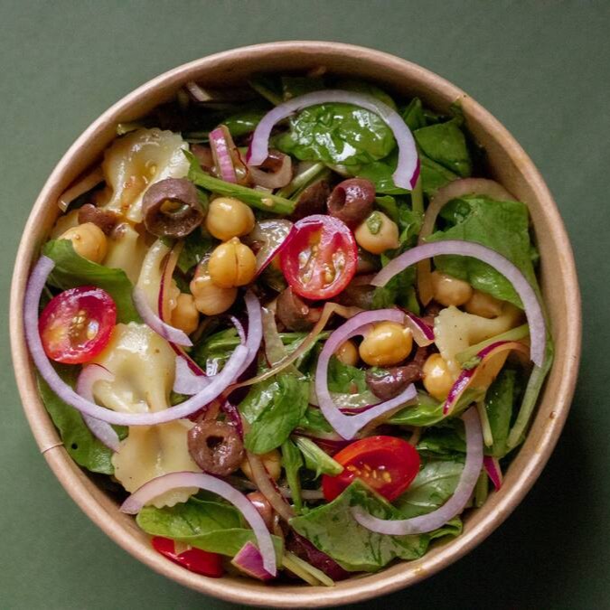 Massa farfalle, rúcula, tomate cereja, grão de bico, azeitonas pretas e cebola roxa. Acompanha molho de mostarda e mel.