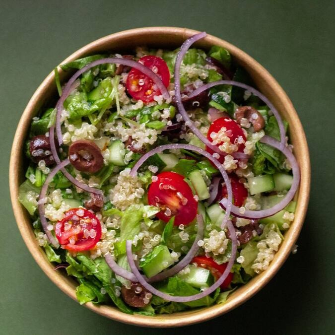 Quinoa, grão de bico, pepino, cebola roxa, tomate cereja, azeitona preta, mix de folhas e molho.