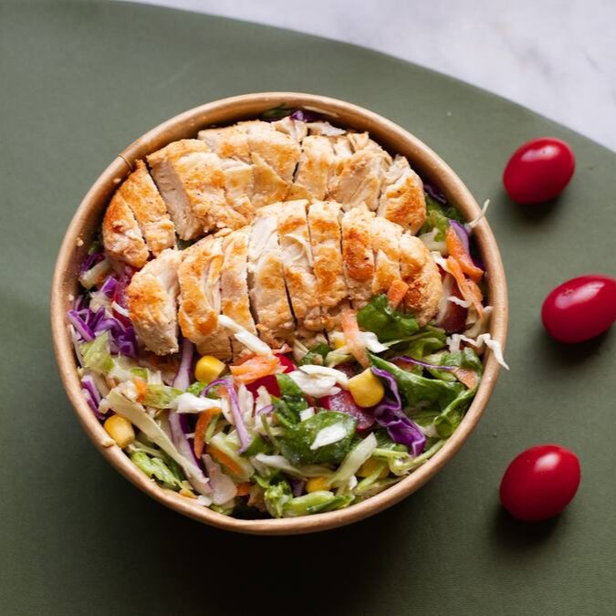 Mix de folhas, repolho roxo, repolho branco, cenoura, milho, tomate cereja e molho. Proteína opcional: ovos cozidos ou filé de frango.