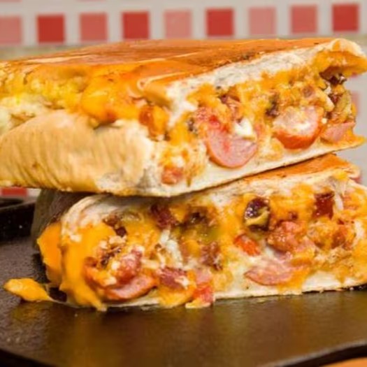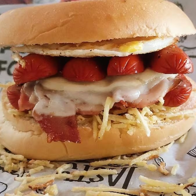 Pão, maionese, 4 salsichas, mussarela, presunto, 2 ovos, bacon e batata palha