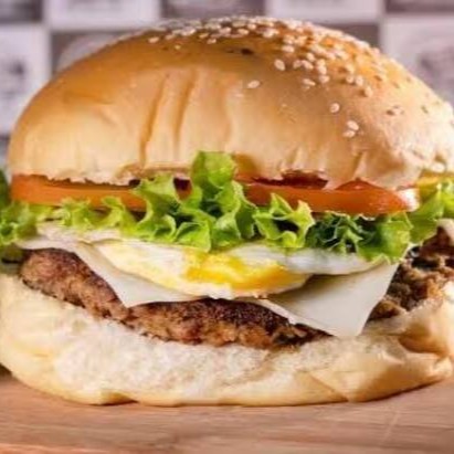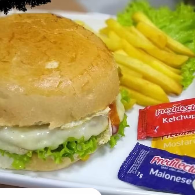 Pão, maionese, hamburguer 90g, mussarela, ovo, alface e tomate