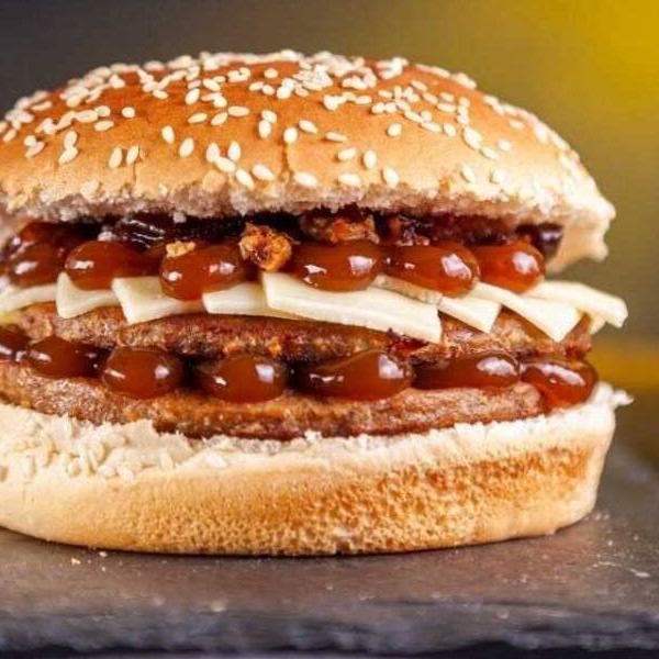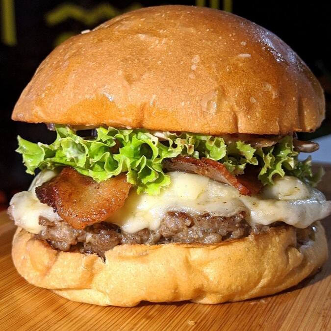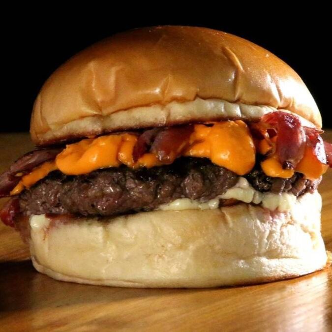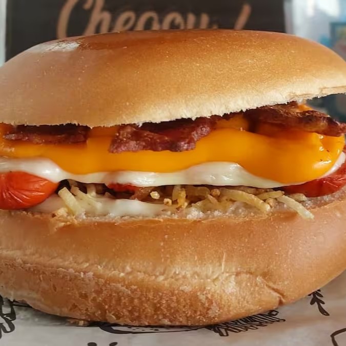 Pão, maionese, hambúrguer, mussarela, cheddar e bacon