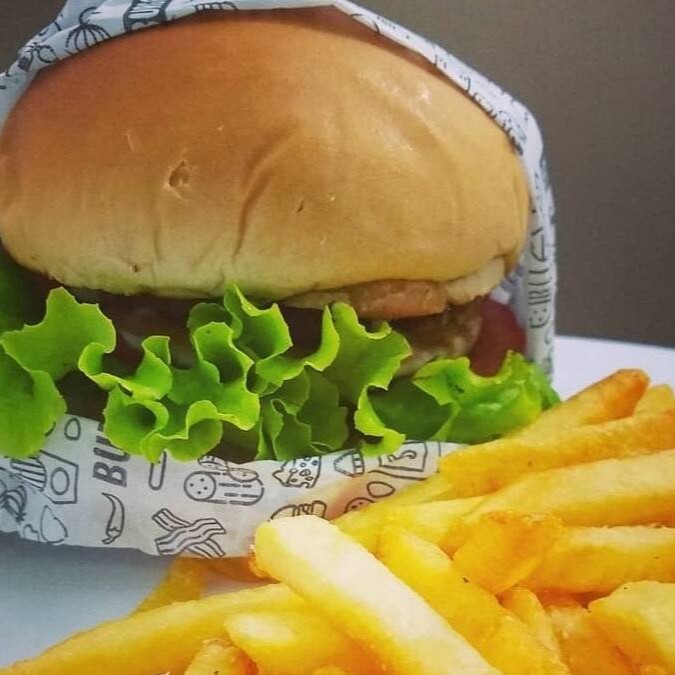 Pão, maionese, 2 hamb, mussarela, bacon e berbecue