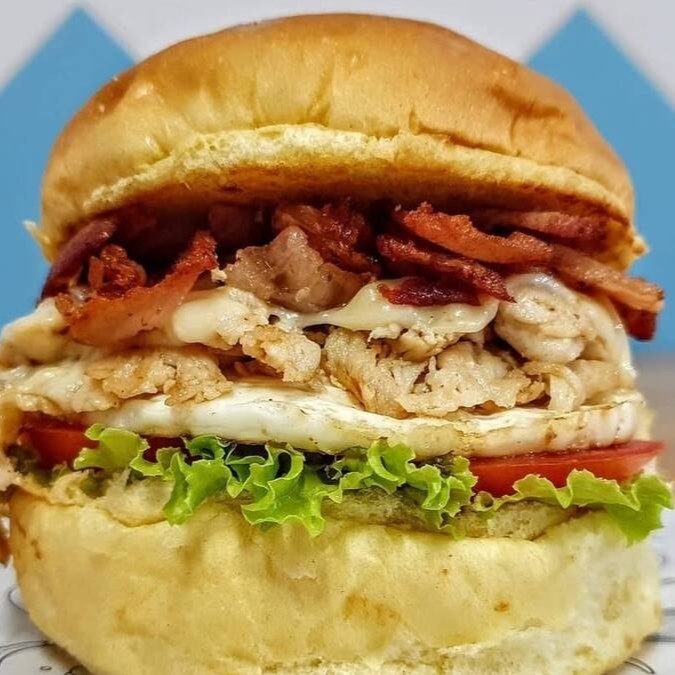 Pão, maionese, hamburguer de frango, mussarela, presunto, ovo, bacon, alface e tomate