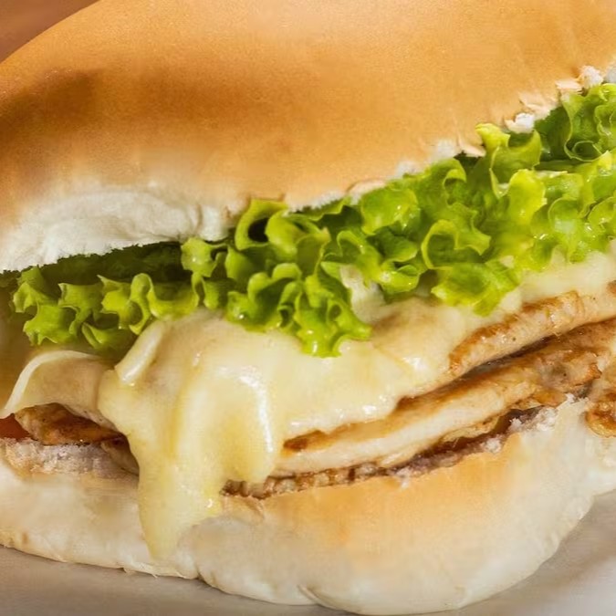 Pão, maionese, hamburguer de frango, mussarela, ovo, alface e tomate