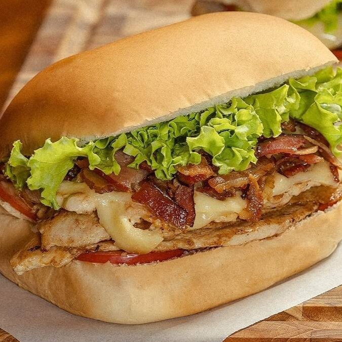 Pão, maionese, hamburguer de frango, mussarela, bacon, alaface e tomate
