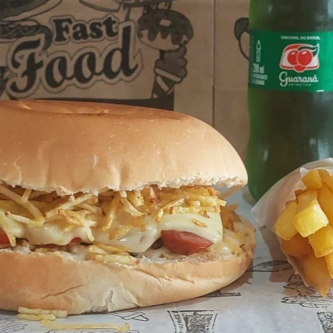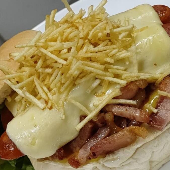 Pão, maionese, 2 salsichas, mussarela, cheddar, bacon e batata palha