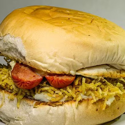 Pão, maionese, 2 salsichas, mussarela, ovo e batata palha
