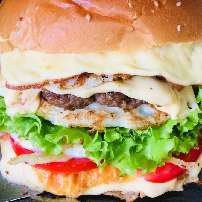 Pão, maionese, 2 hambúrguer, 2 ovos, mussarela, presunto, bacon, alface e tomate
