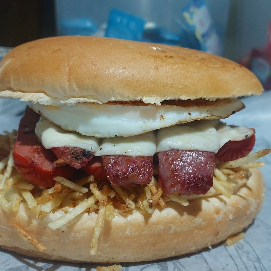 Pão, maionese, 2 salsichas, mussarela, presunto, ovo, bacon e batata palha