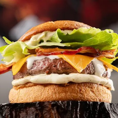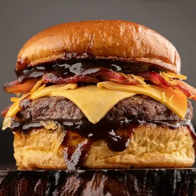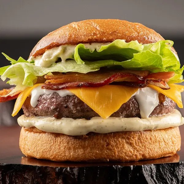 Mata a fome de qualquer gigantecom 360g de carne do gado europeu Angus, bacon top, 2x queijo prato mineiro do bom, 2x cream cheese top das galáxias, cebola caramelizada, alface, pão de brioche amanteigado e maionese da casa