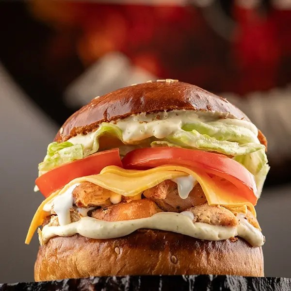 80g De Peito De Frango Defumado, Pão Brioche, Cream Cheese, Alface, Tomate E Maionese Da Casa.