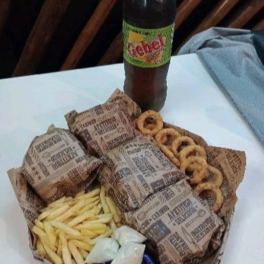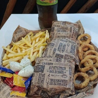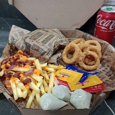 Frango tudo mini + 200 gr de batata Bacon cheddar + onions ring + refrigerante lata