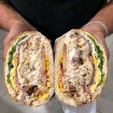 Pão de hambúrguer grande, salsicha, presunto, queijo , vinagrete, milho, batata palha.