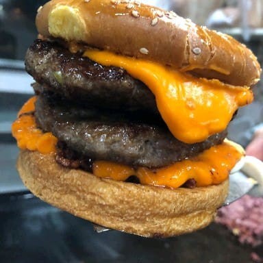 Pão de brioche , 2 hambúrgueres artesanais, bacon, cheddar, cebola roxa.
