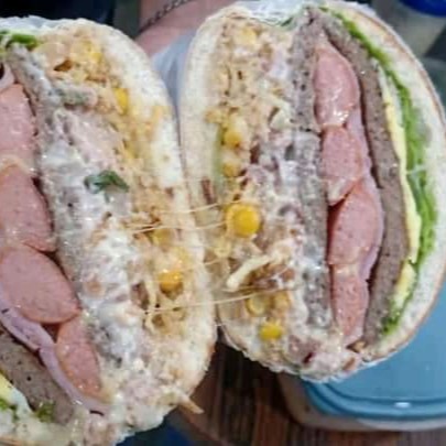 Pão, hambúrguer 'presunto, queijo,ovo, Bacon, alface ,tomate ,milho