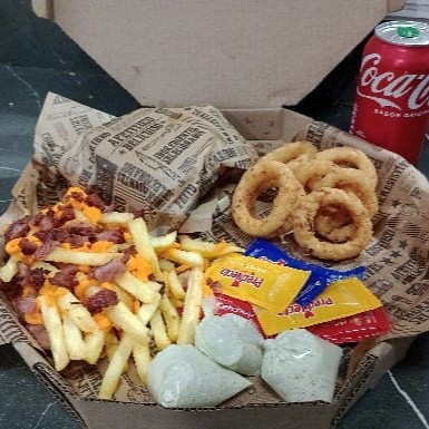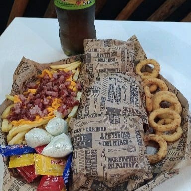 3 mini lanches opções (x Bacon/x salada /xegg) + batata com Bacon e cheddar onions ring refrigerante 2 lt