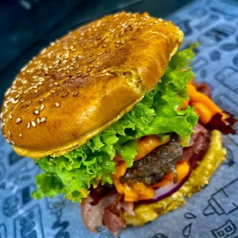 Pão de brioche , hambúrguer artesanal, bacon,cheddar,ovo, alface ,tomate, cebola roxa.Todos os lanches artesanais acompanha 100gr de batata