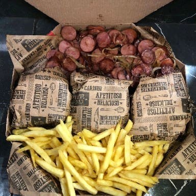 Pão de hambúrguer grande, salsicha, presunto, queijo ,bacon, Catupiry,vinagrete, milho, batata palha.