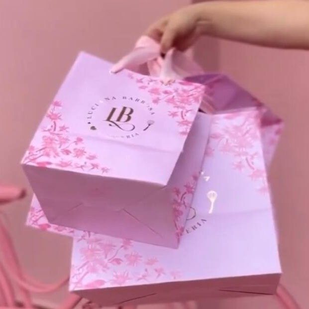 Sacola de papel com alça de gorgurão para presentear - linda estampa de Cerejeira e Lb Gold ideal para surpreender!