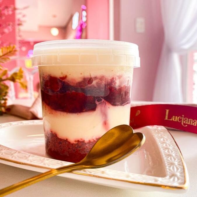 Delicioso creme de Ninho intercalado com nossa maravilhosa geleia de frutas vermelhas orgânicas e finas camadas de bolo red velvet.